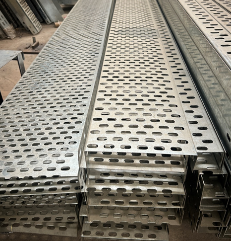 A cable tray system supports insulated electric cables for power distribution and communication,